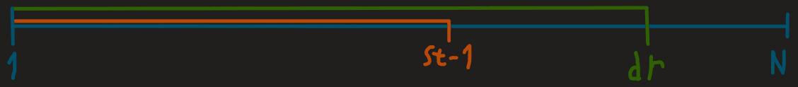 În final, subsecvența va fi alcătuită din acele poziții care se află în segmentul mov, dar nu în segmentul roșiatic (). Așadar, în urma acestei delimitări o să obținem suma cerută pe intervalul nostru.