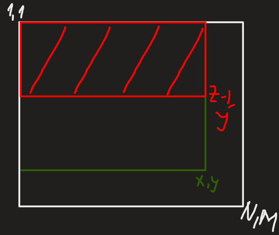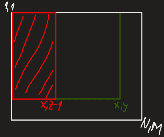 Șmenul lui Mars aplicat pe o matrice presupune înțelegerea mai profundă a cum se propagă sumele parțiale pe matrice. Să presupunem că avem submatricea delimitată de colțurile și . Dacă o să facem doar o adunare și o scădere ca la cazul liniar din șmenul lui Mars, propagările noastre vor fi foarte eronate. Să privim în desen de ce:
